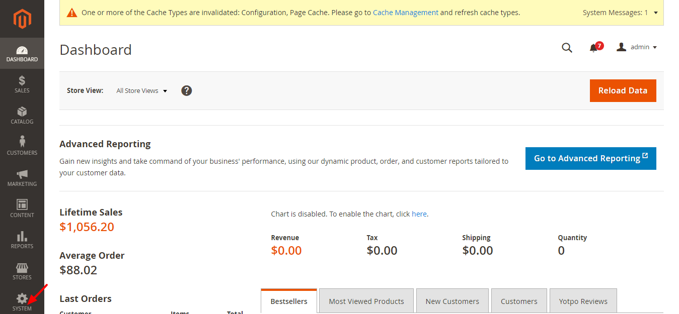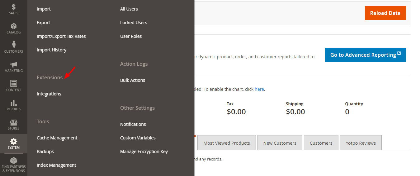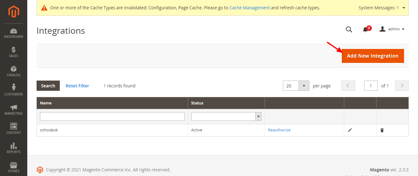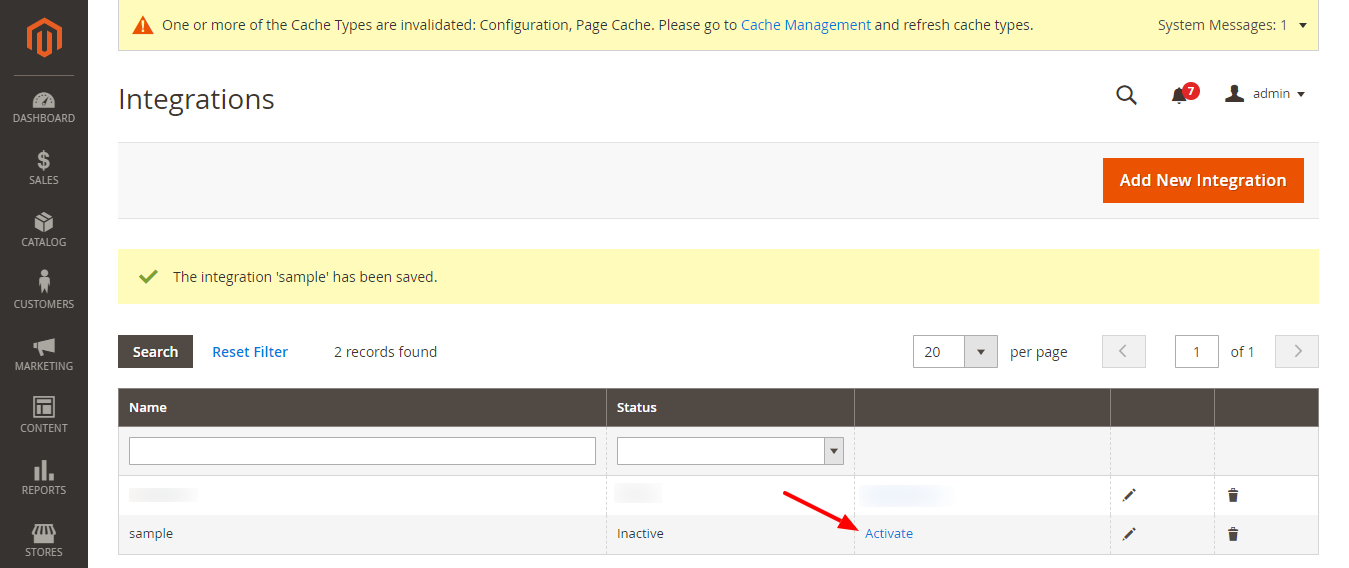 - Log in to the ADMIN URL and navigate to System > Extensions > Integrations to access the Integrations page.