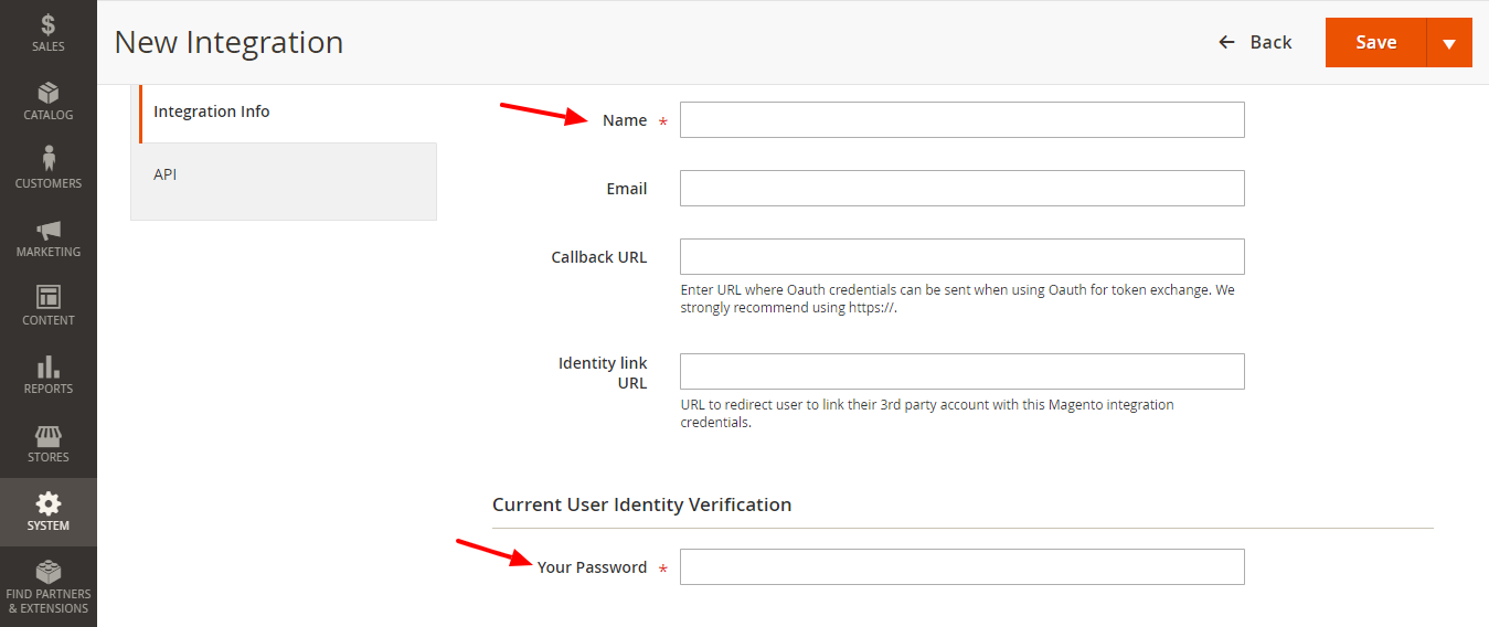- Enter a unique name for the integration in the Name field and your admin password in the Your Password field. Leave other fields empty.