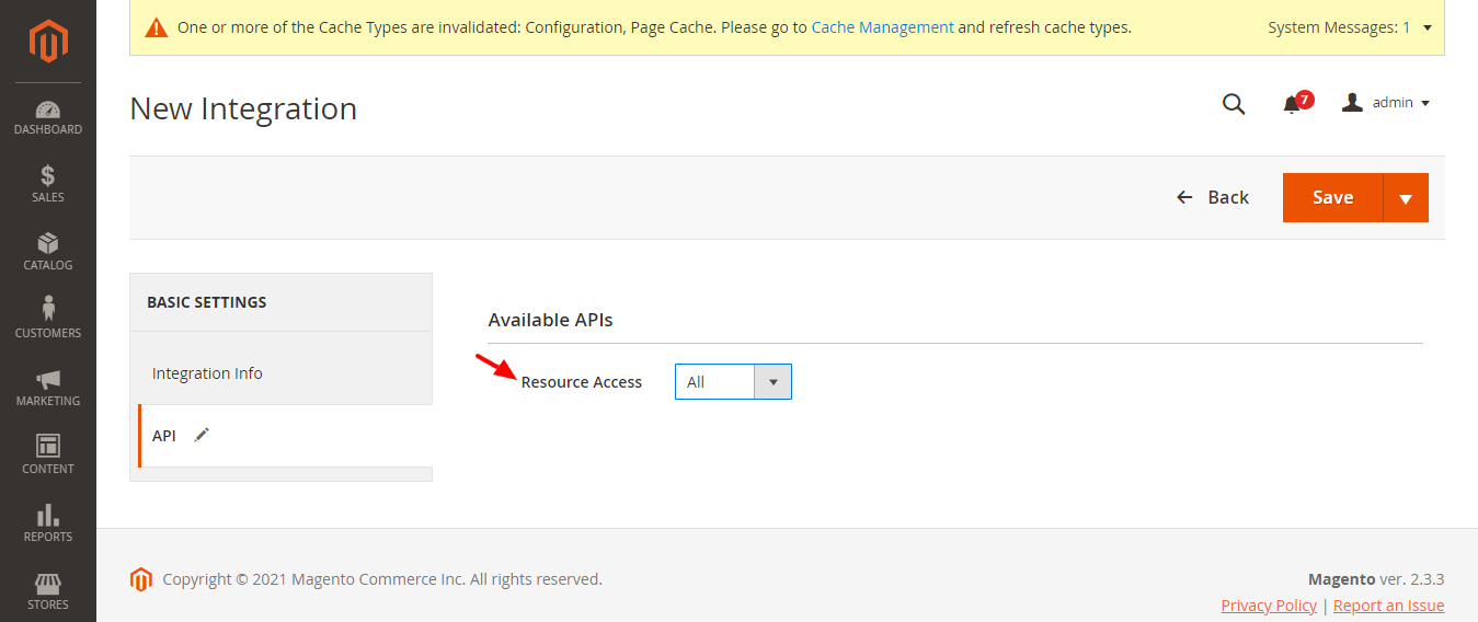 - Move to the API tab and choose the Magento resources the integration should access. You can select all resources or a custom list.