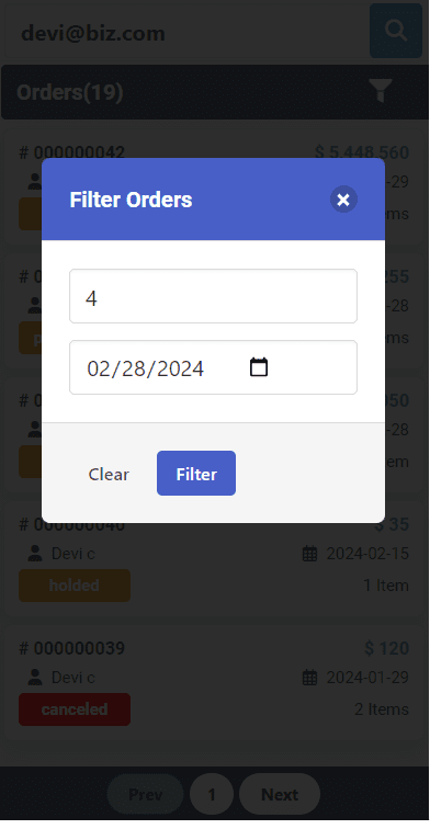 This action opens a modal where you can enter the Order ID and Date, then click the Filter button