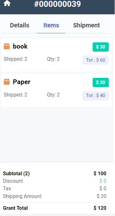 Within the same email, you can also view comprehensive order item details such as the ordered products, quantities, individual item prices, shipped item counts, Grand Total, Subtotal, Tax, and any applied discounts.