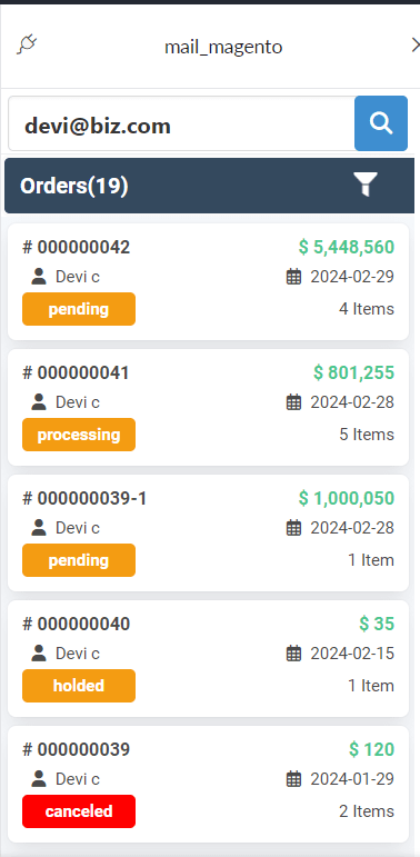 - With this integration, you can effortlessly access specific customer order details directly from Zoho Mail, eliminating the need to navigate to your Magento account for viewing orders.