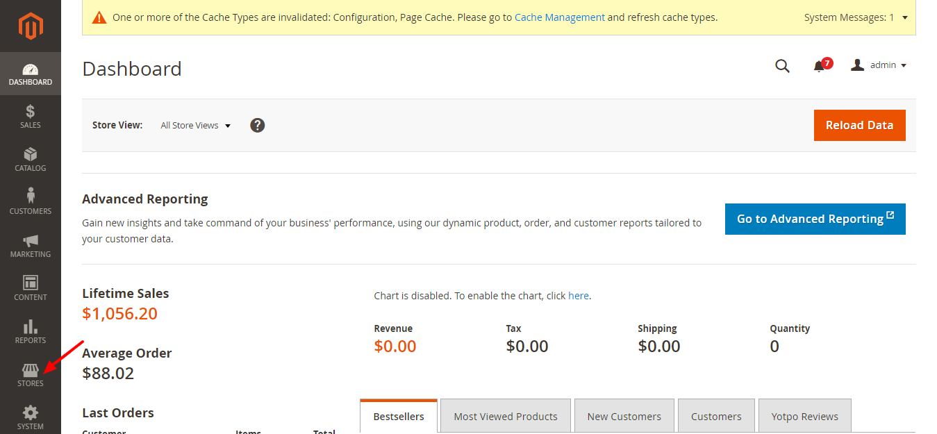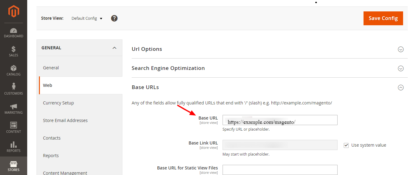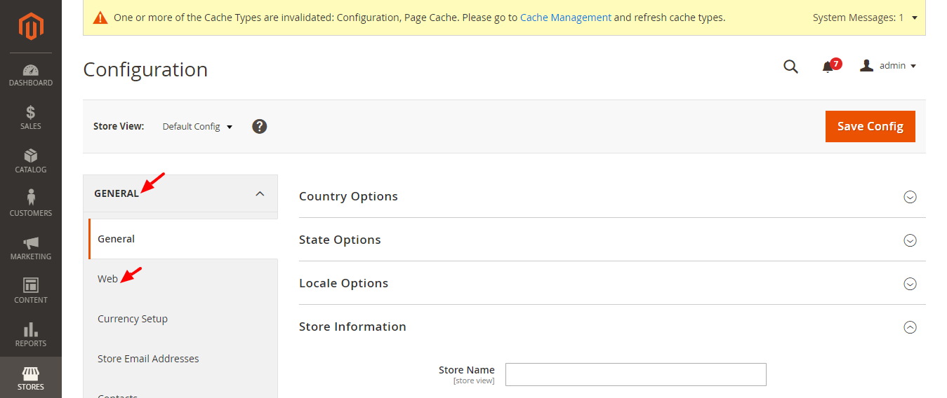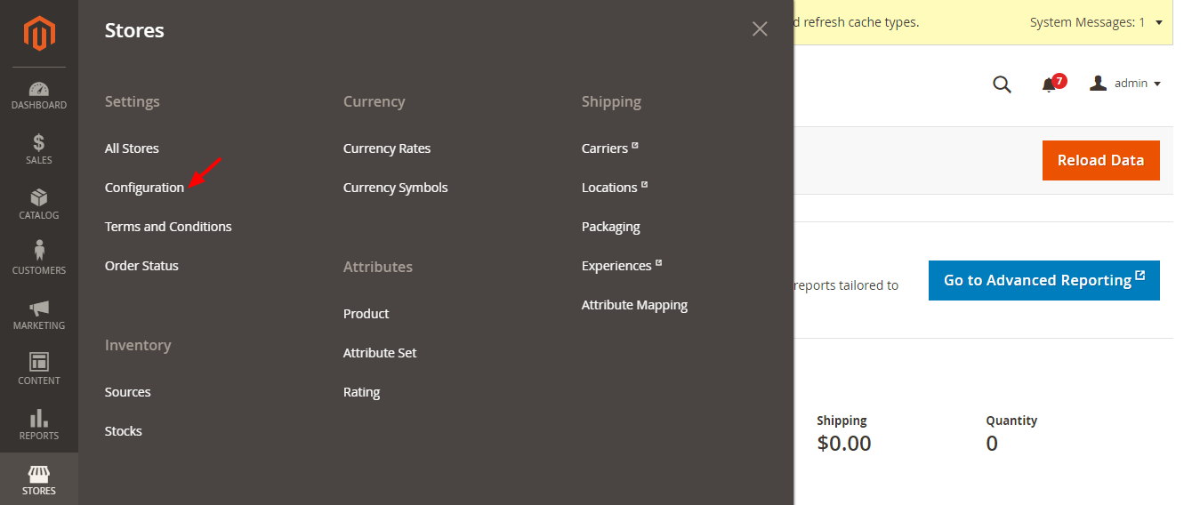 - Navigate to the Magento Admin panel. In the sidebar, locate and click on the STORES option. This action will open a side panel. Within the side panel, you'll find the Settings section. Click on Configuration under this section, and it will navigate you to Configuration tab.