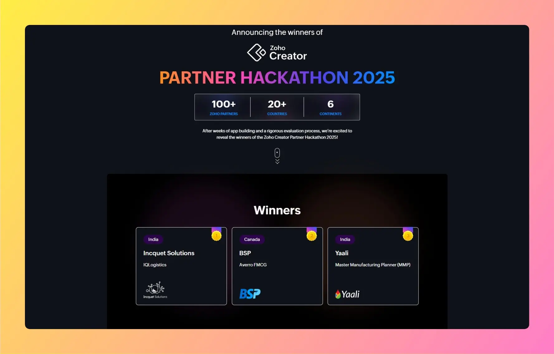 The Zoho Creator Partner Hackathon 2025 brought together the brightest minds in low-code application development from across the globe. Zoho Partners were challenged to build solutions that addressed real-world business problems with depth, innovation, and practical applicability. The evaluation process was rigorous, examining not just technical execution but also domain expertise, user experience design, and the potential for meaningful business impact.